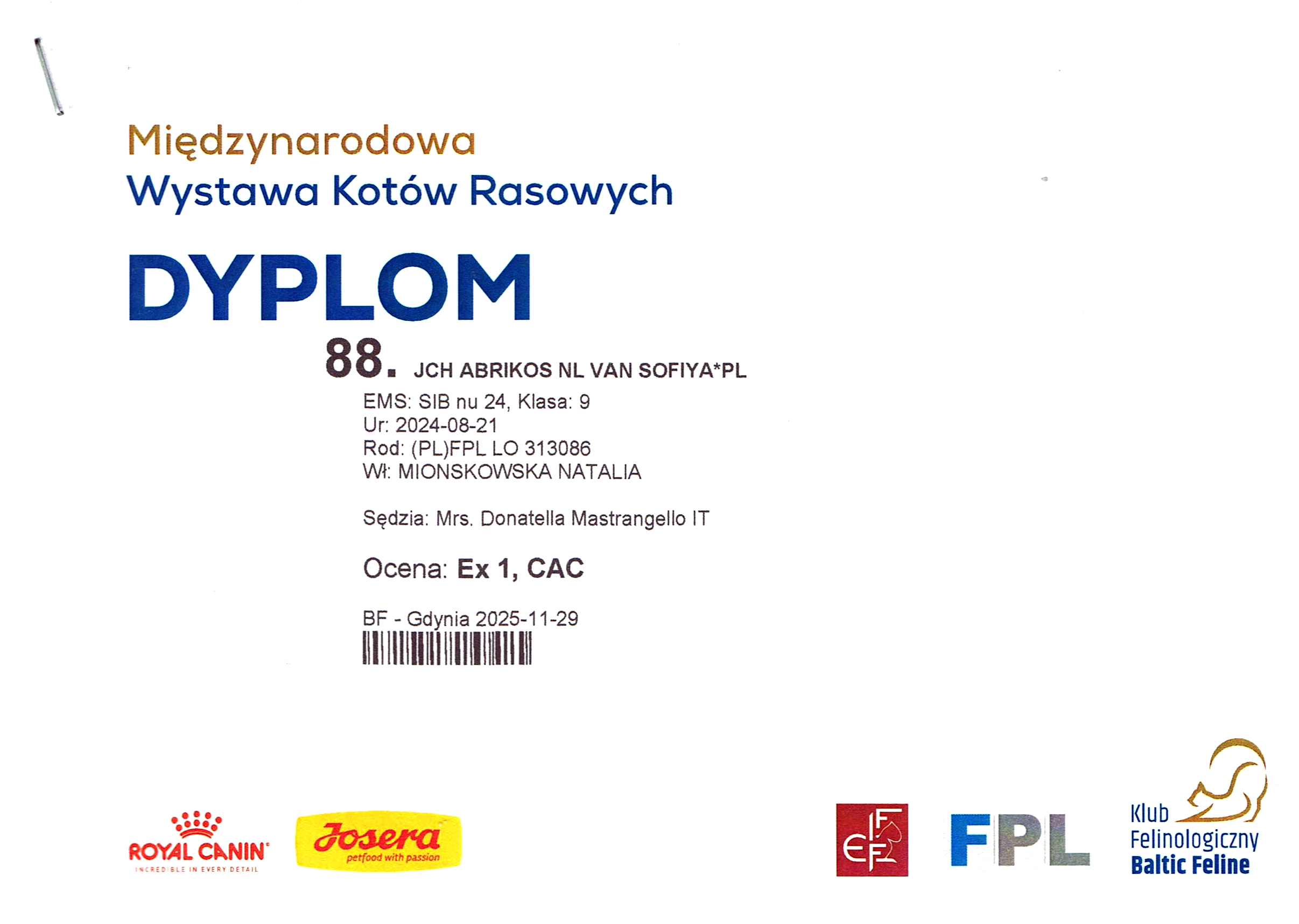 | KLUB FELINOLOGICZNY BALTIC FELINE | POLSKA - GDYNIA | 29-11-2025 | DONATELLA MASTRANGELLO | Ex1 CAC |