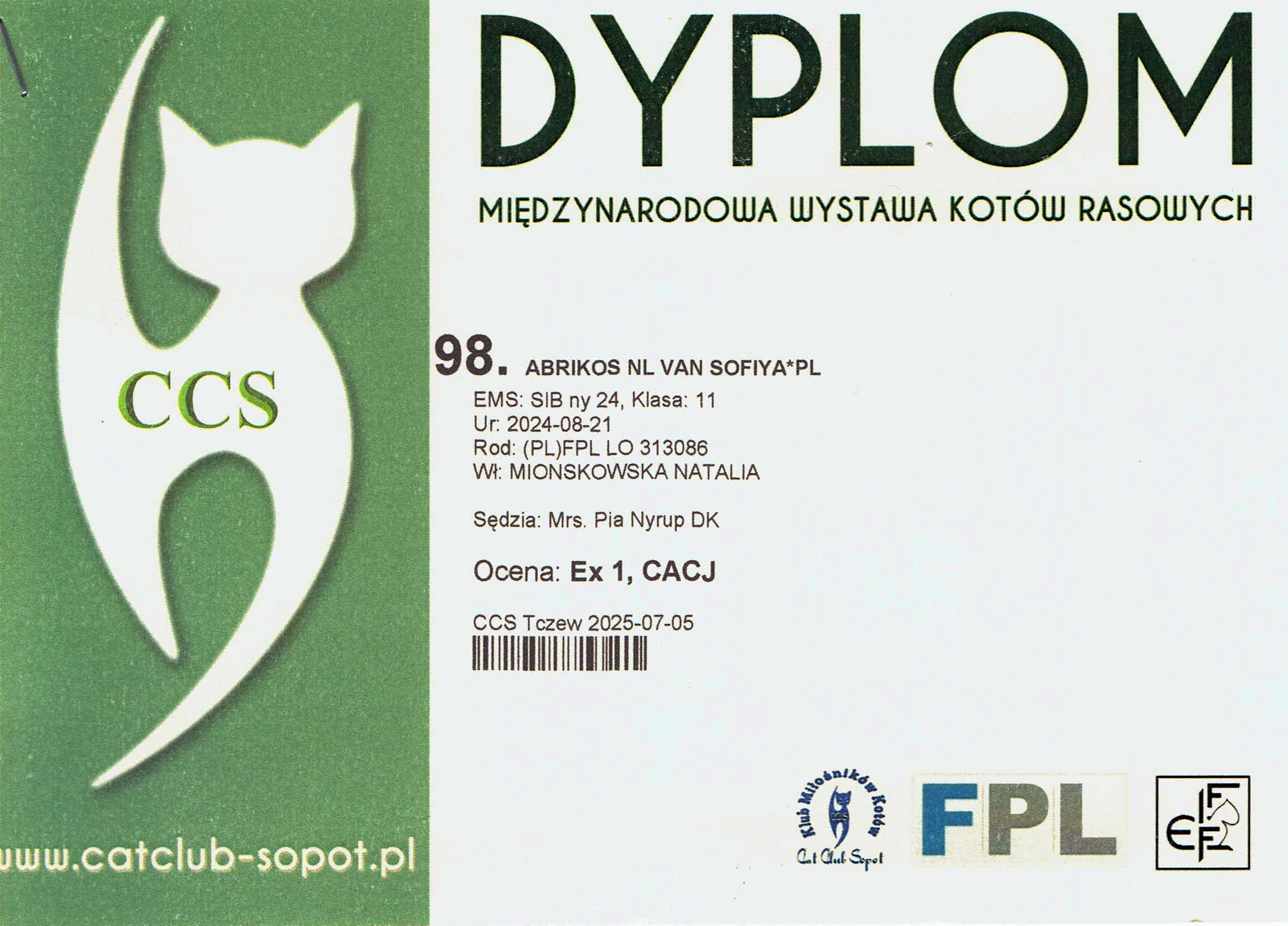 | KLUB FELINOLOGICZNY BALTIC FELINE | POLSKA - TCZEW | 05-07-2025 | PIA NYRUP | Ex1 CACJ |