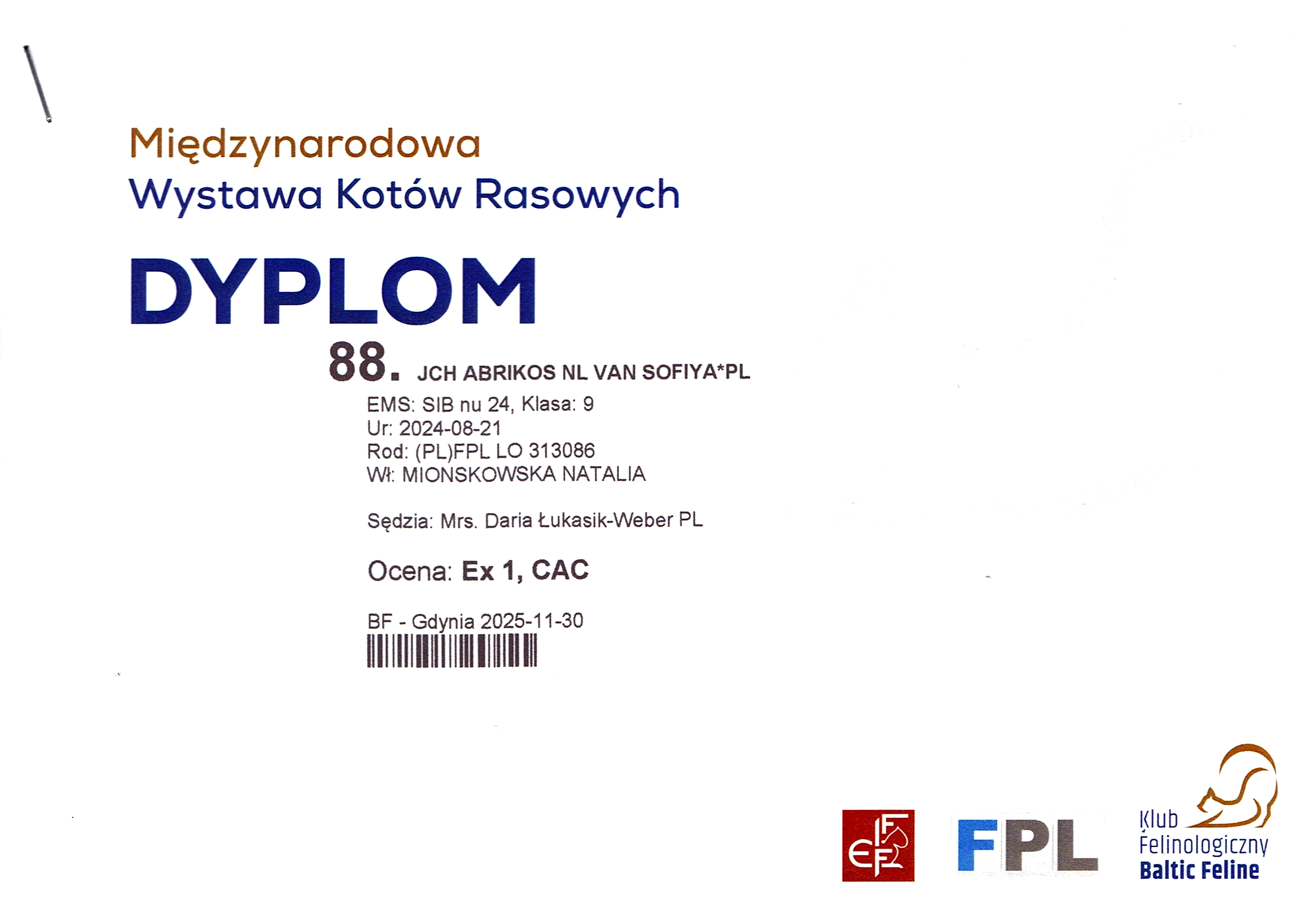 | KLUB FELINOLOGICZNY BALTIC FELINE | POLSKA - GDYNIA | 30-11-2025 | DARIA ŁUKASIK-WEBER | Ex1 CAC |